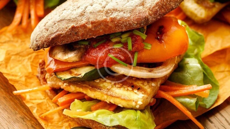 A large patty served with lettuce, tomato, and onion in a bread.
