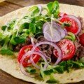 Ground beef, corn & wheat tortilla, cheese, vegetables and red sauce.